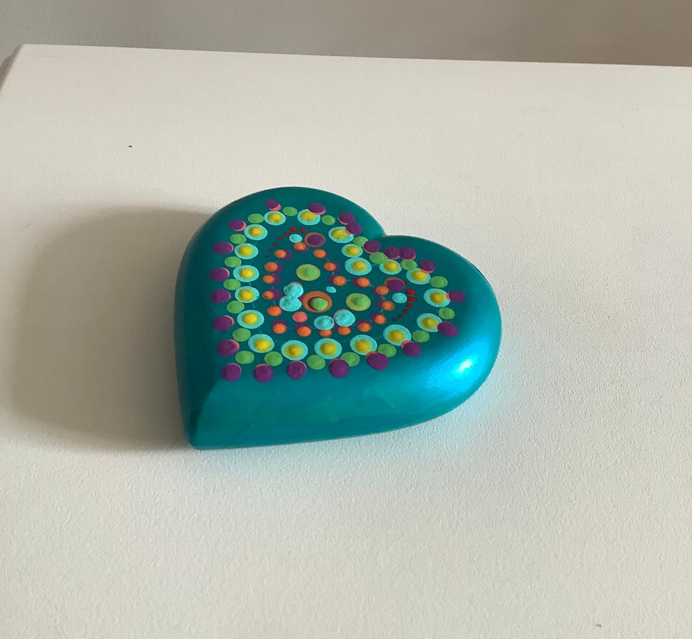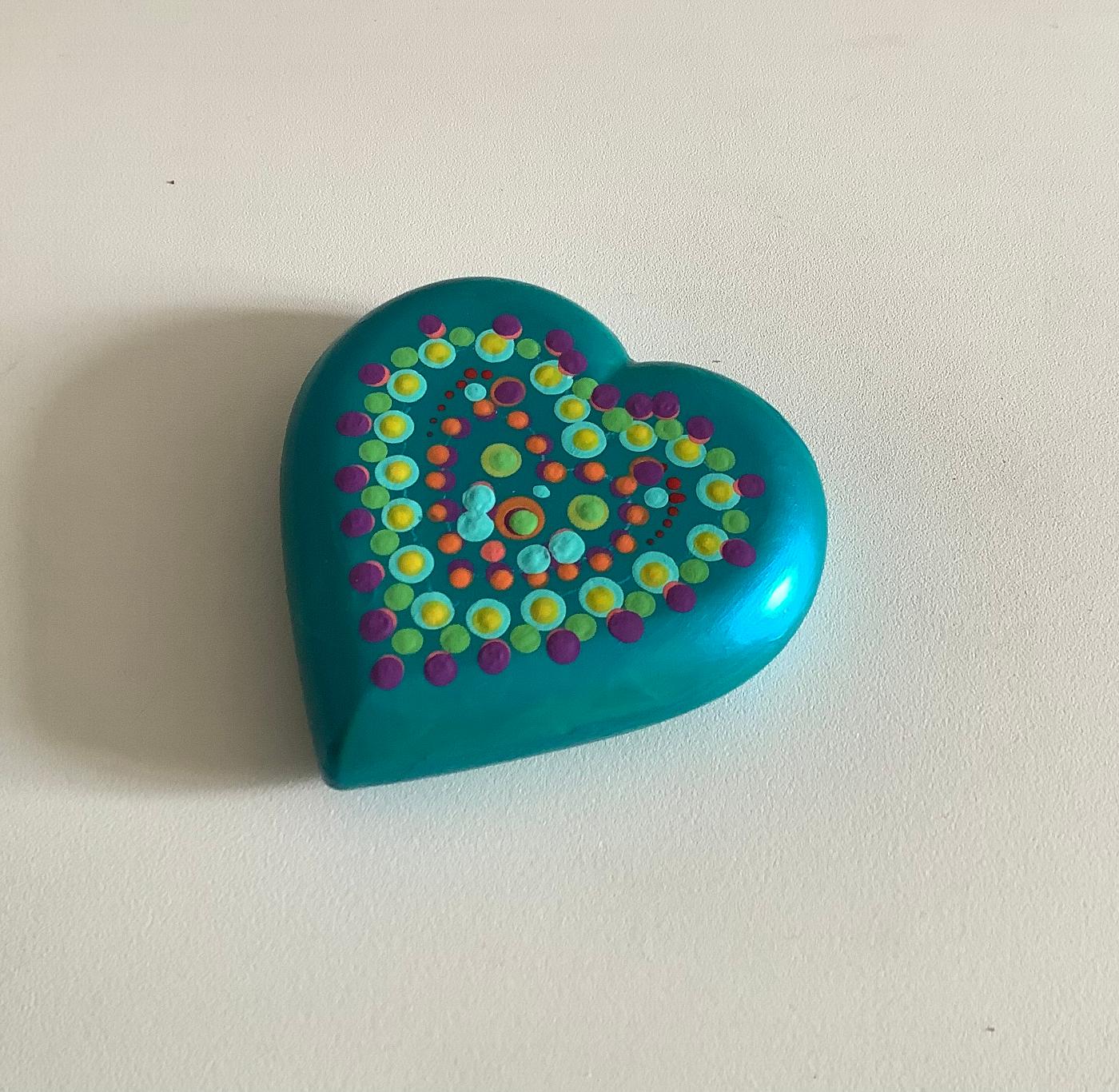 A flat stone plaster heart with turquoise base colour and dotted with various colours.