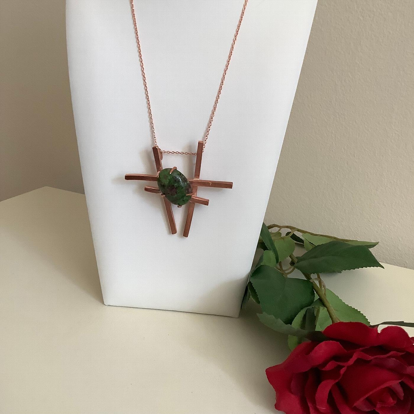The first item in my new collection of jewellery. Made with pure copper pieces, brought together in a geometric shape, I have attached a cabachon as an extra feature. It includes a copper chain.