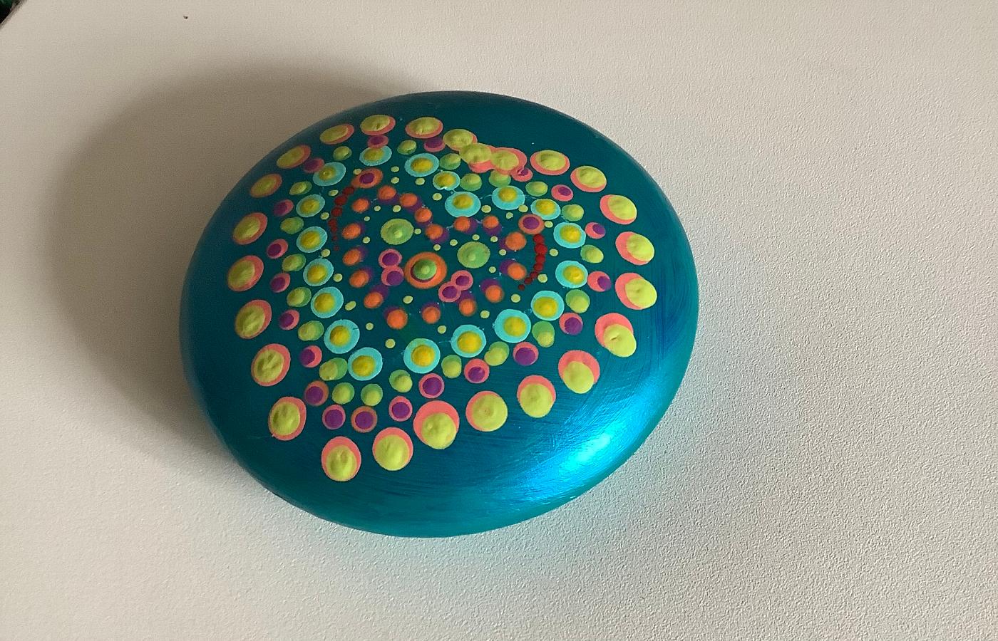 Dot Art is a style of painting created by the dotting of paint, rather than brush strokes. In its finest form, it is called Pointillism, where very small, distinct dots of pure colour are applied in patterns to form an image. In Dot Art, the dots are traditionally applied with a stick, but various instruments can be used - the bottom of a pencil, a stylus, rods...I use the bottom of wooden crochet hooks! The dots vary in size and colour, and are applied to a surface to create beautiful patterns and designs. The versatility of this art form allows you to experiment on many different materials - wood, slate, paper, canvas and many more. It is the most relaxing and mindful activity I have ever found over the years.