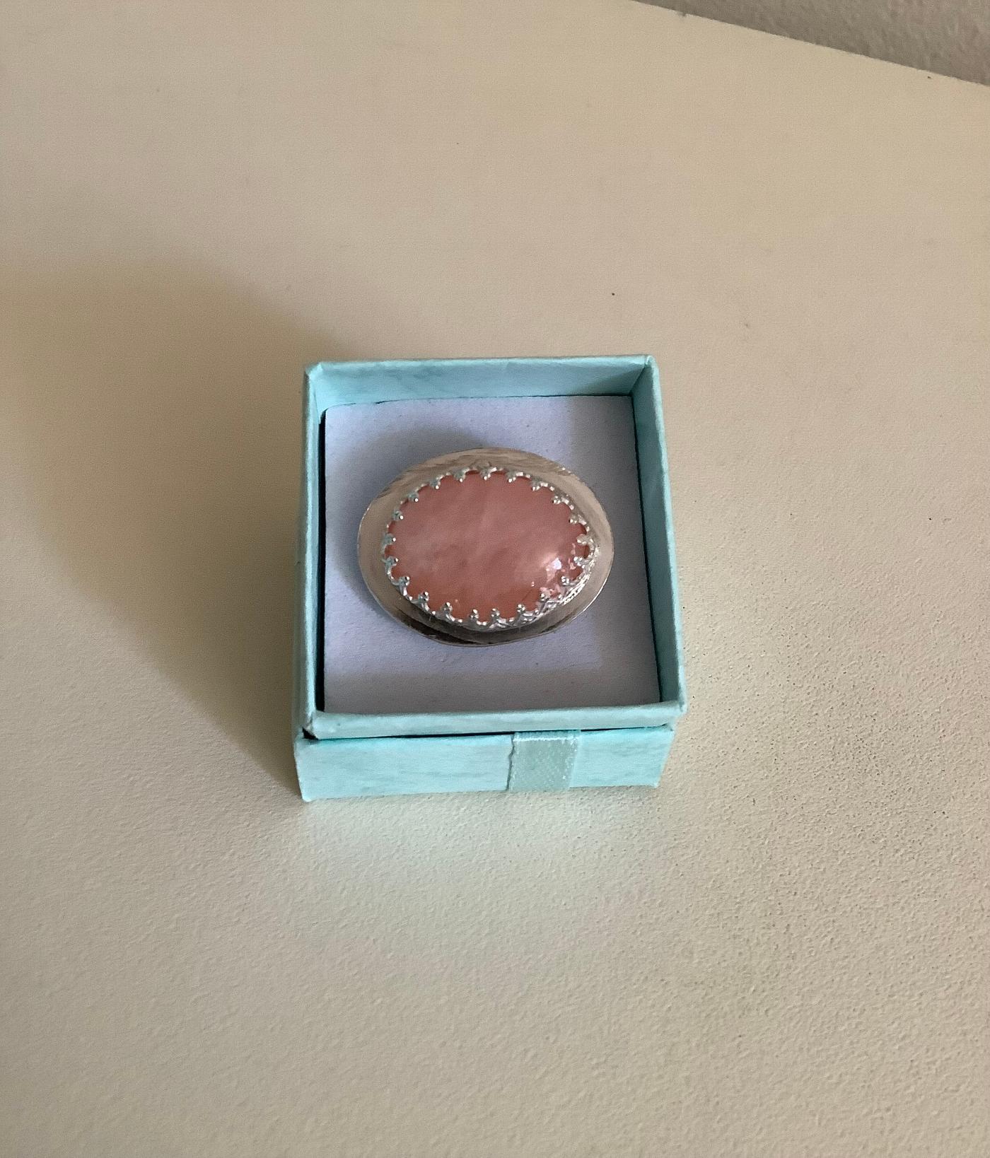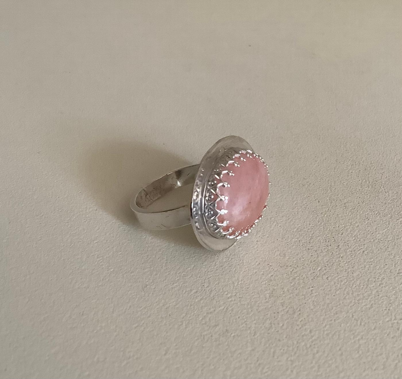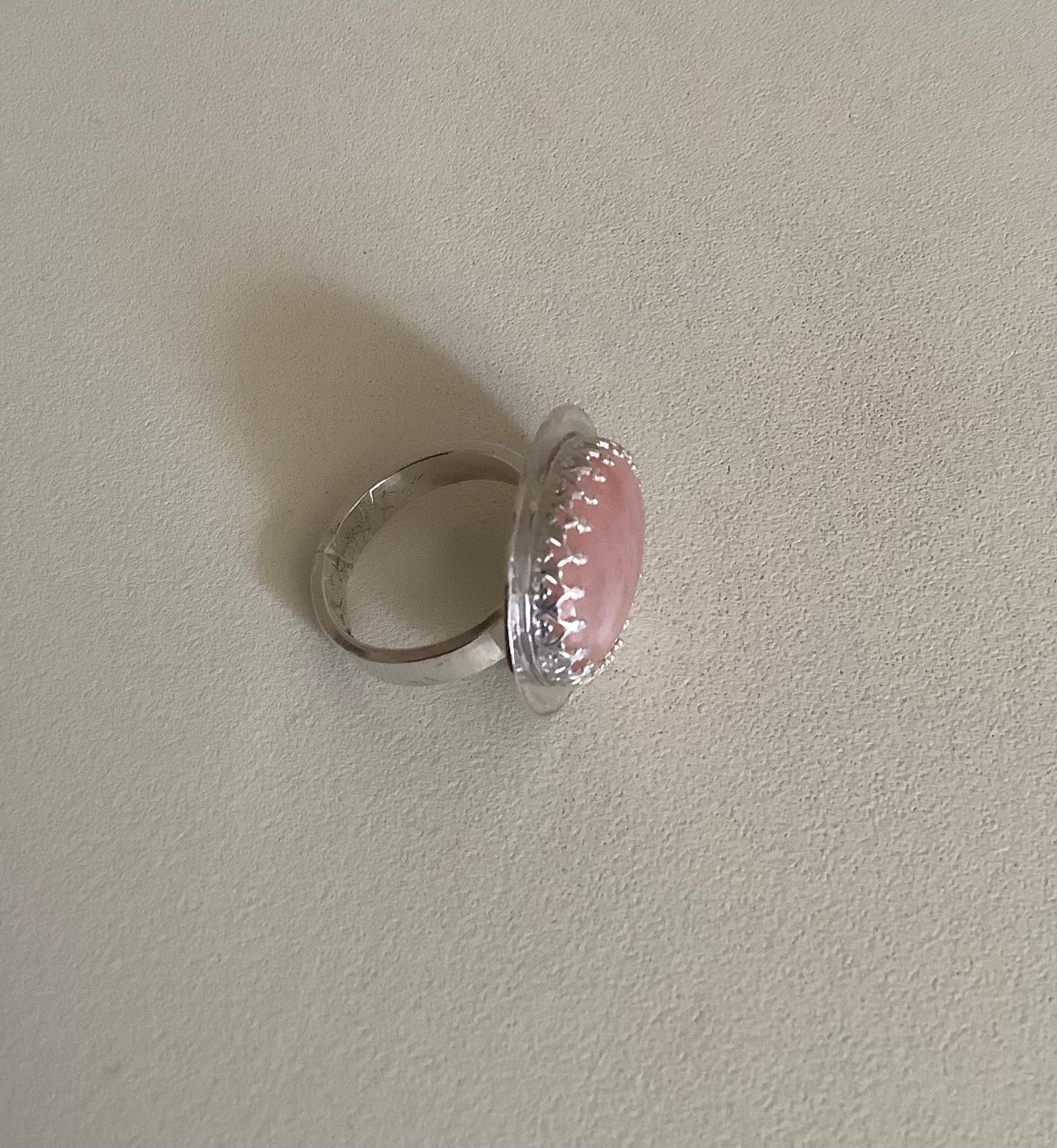 An oval sterling silver setting with a pink opal cabochon and border. The ring itself is size 'M'.