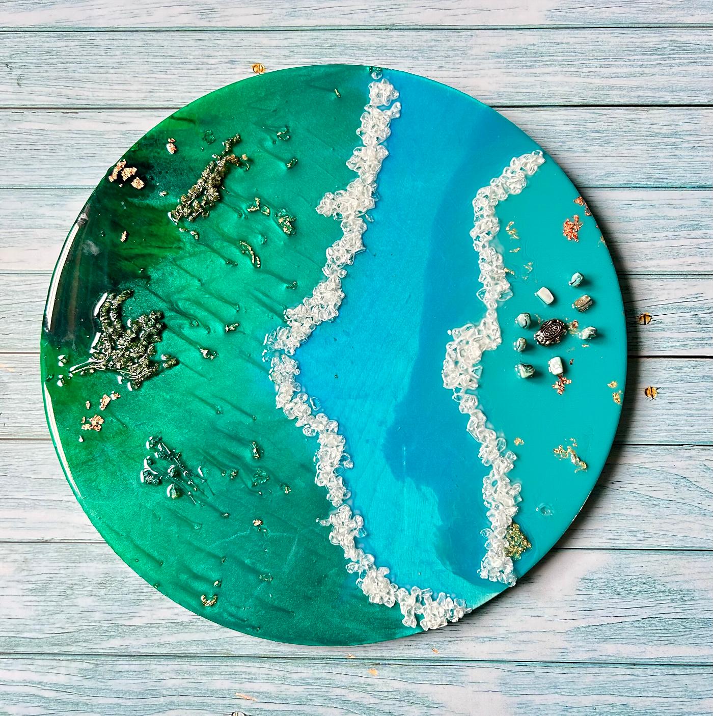 Embark on a journey of discovery with this unique mixed media resin painting, crafted on a wooden base (4ocm diameter).