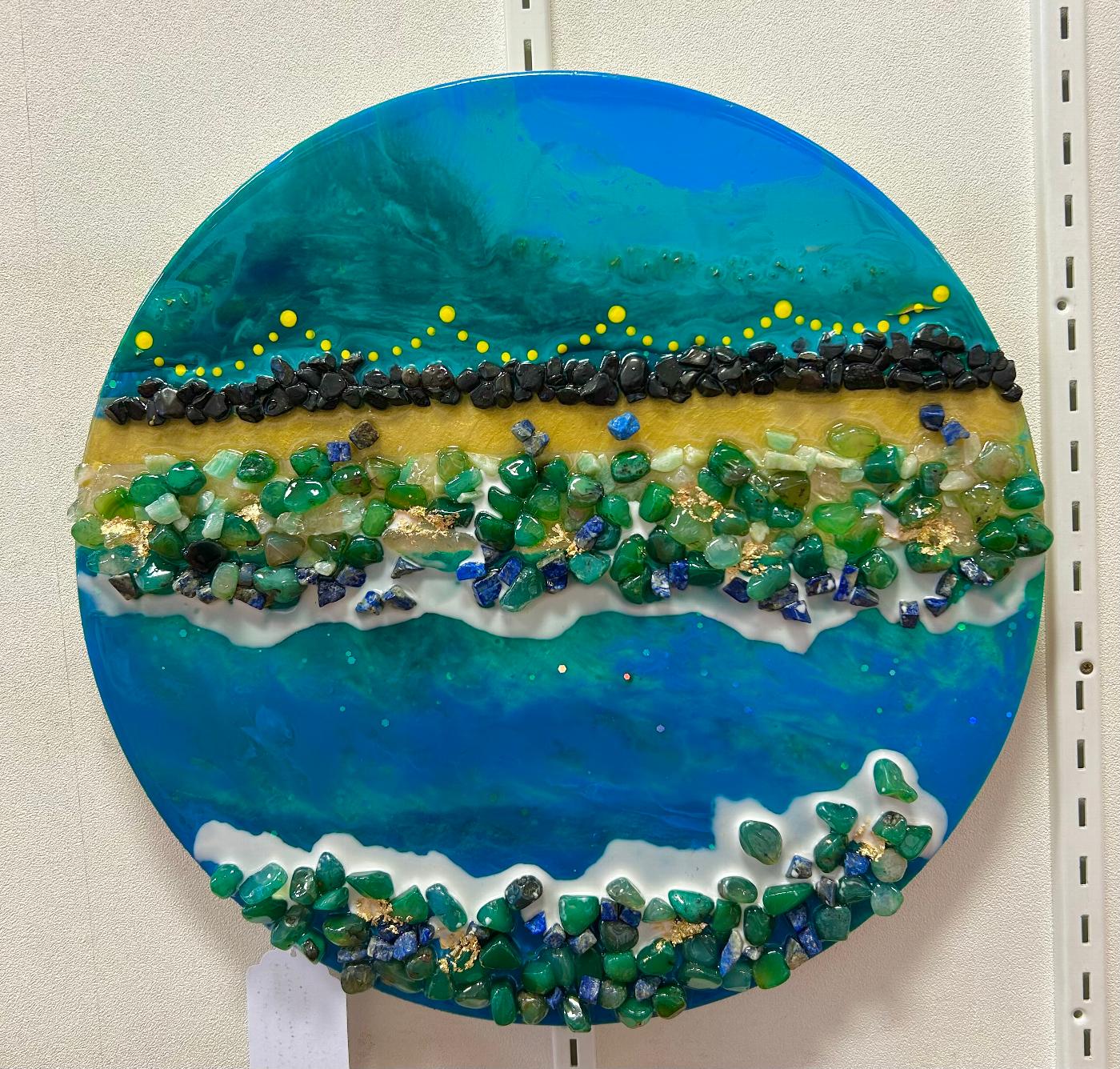 A mixed media resin painting, using resin, coloured pigment, sea glass, crystals, and dot art set on a wooden base (40 cms diameter)