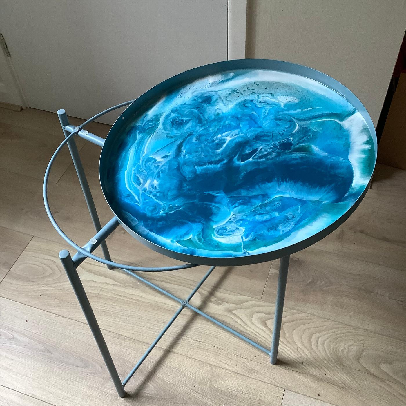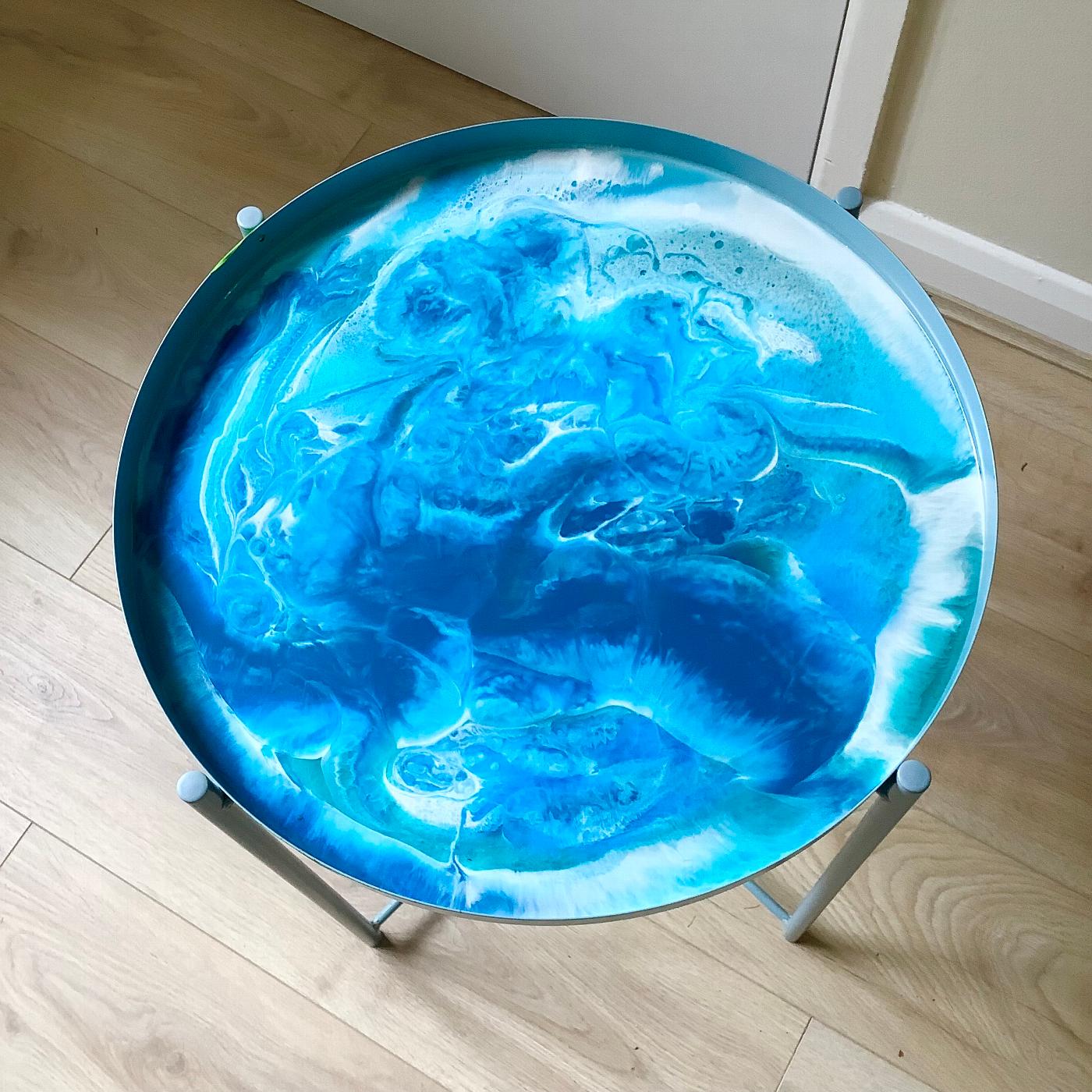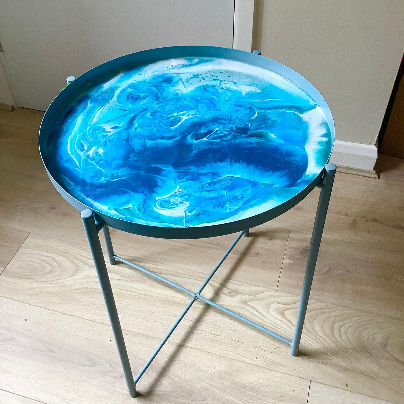 This is a sturdy side or occasional table which has been embellished with resin in blues and whites. The top is removeable. This table would compliment any room...it would look lovely as a side table in the lounge or conservatory.