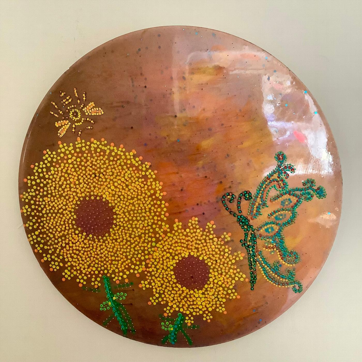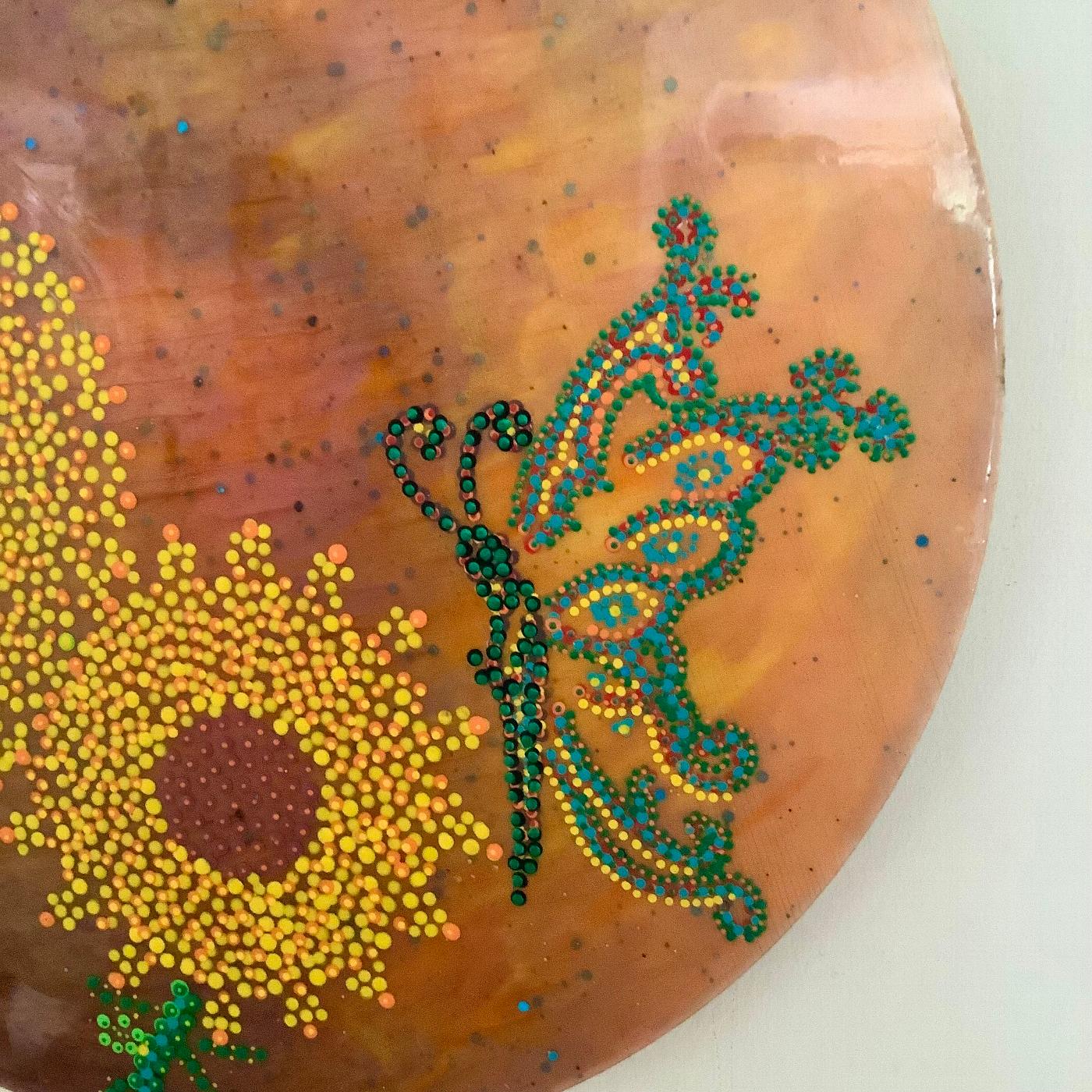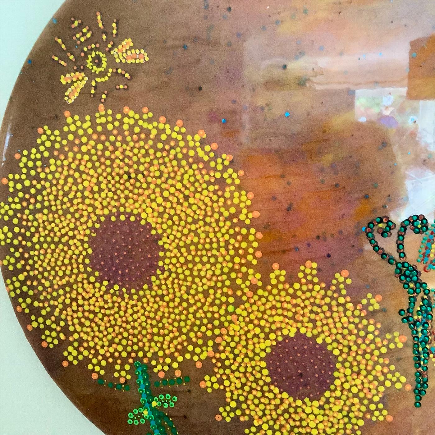 A mixed media resin painting, using resin, warm summer coloured pigments and dot art, set on a wooden base (40 cms diameter).